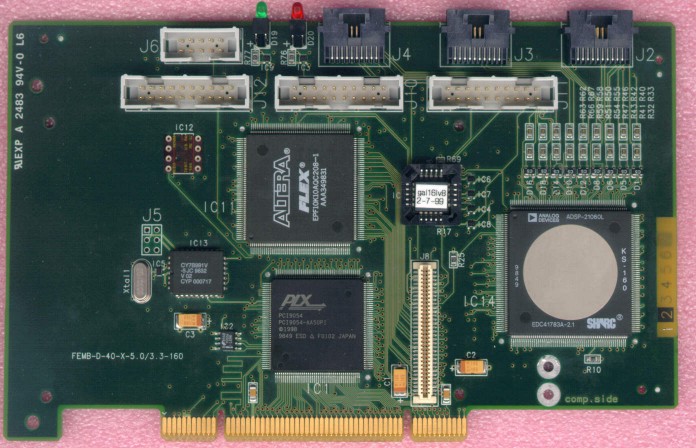 The block diagram of the module comprises a PCI interface chip (PLX9054), a SHARC procesor, an Altera FPGA (10K10A) and a (40 MHz) S-LINK output and can also be used as programmable S-LINK data source.