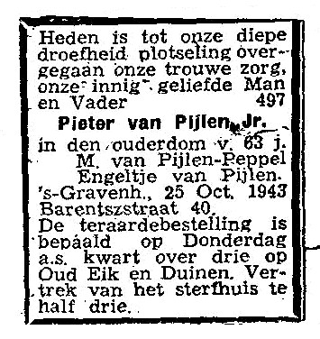 Overlijdensadvertentie van Pieter van Pijlen (1880-1943).